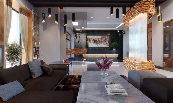 Вестибюль корпуса Художественный оформ - лен в современном лаконичном стиле, передающем эпоху стремительного промышленного и культурного роста Серебряного века. Венцом интерьера является авторский водопад с косяками золотых рыб, символизирующими умиротворение в городе — мире постоянного движения. В восточной мифологии рыба символизирует изобилие, богатство, плодородие и гармонию